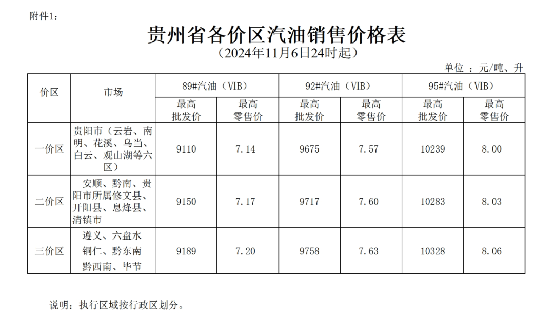 根据成品油价格形成机制,国家发展改革委决定自2024年11月6日24时起下调国内成品油价格。按照国家调整要求和相关规定,我省89#汽油(国VIB)、0#柴油价格每吨在现行标准基础上分别降低145元、140元,具体价格可由各经营企业在不超过最高批发、零售价格的前提下确定。调整后各油品最高价格见附件。