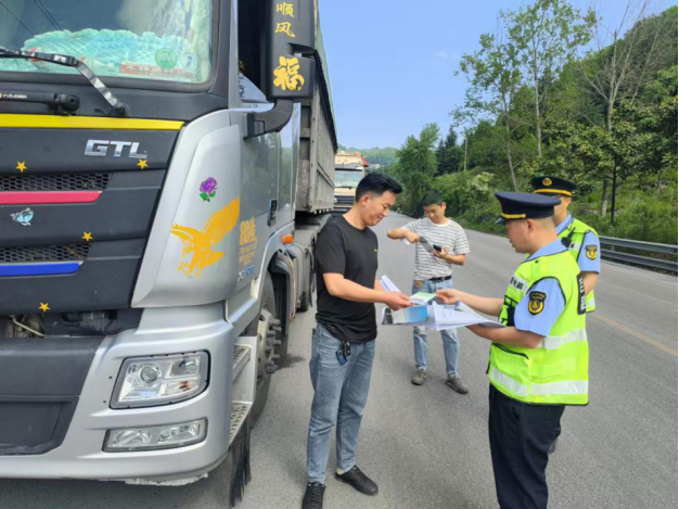 执法人员向过往货车司机宣传超限运输的危害
