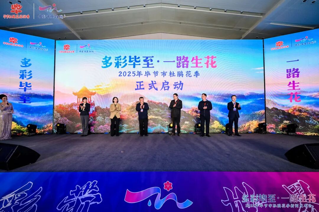会上,中共毕节市委常委、宣传部部长张建军,毕节市人民政府副市长游劲松,贵州省文化和旅游厅四级调研员周乾远,中共毕节市委宣传部副部长、市文化广电旅游局党组书记、局长饶萍,百里杜鹃管理区党工委书记刘元刚,百里杜鹃管理区党工委副书记、管委会主任彭婷共同触屏,标志着“多彩毕至·一路生花”2025毕节市杜鹃花季正式启动!