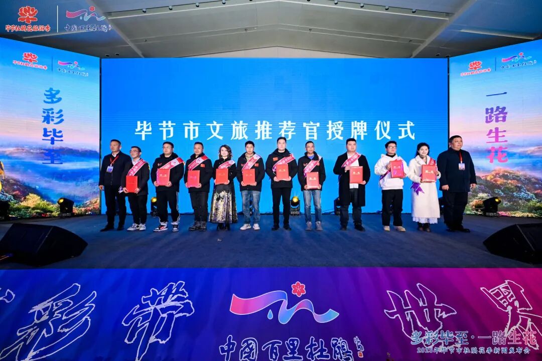 发布会上,还进行了“毕节文旅推荐官”授牌仪式,毕节市委网信办副主任李双锣、毕节市文化广电旅游局党组成员、副局长卯洪为多位网络达人颁发“文旅推荐官”聘书,他们将通过镜头和文字,向全国游客展示毕节的春日之美,持续提升“洞天福地·花海毕节”的知名度和影响力。