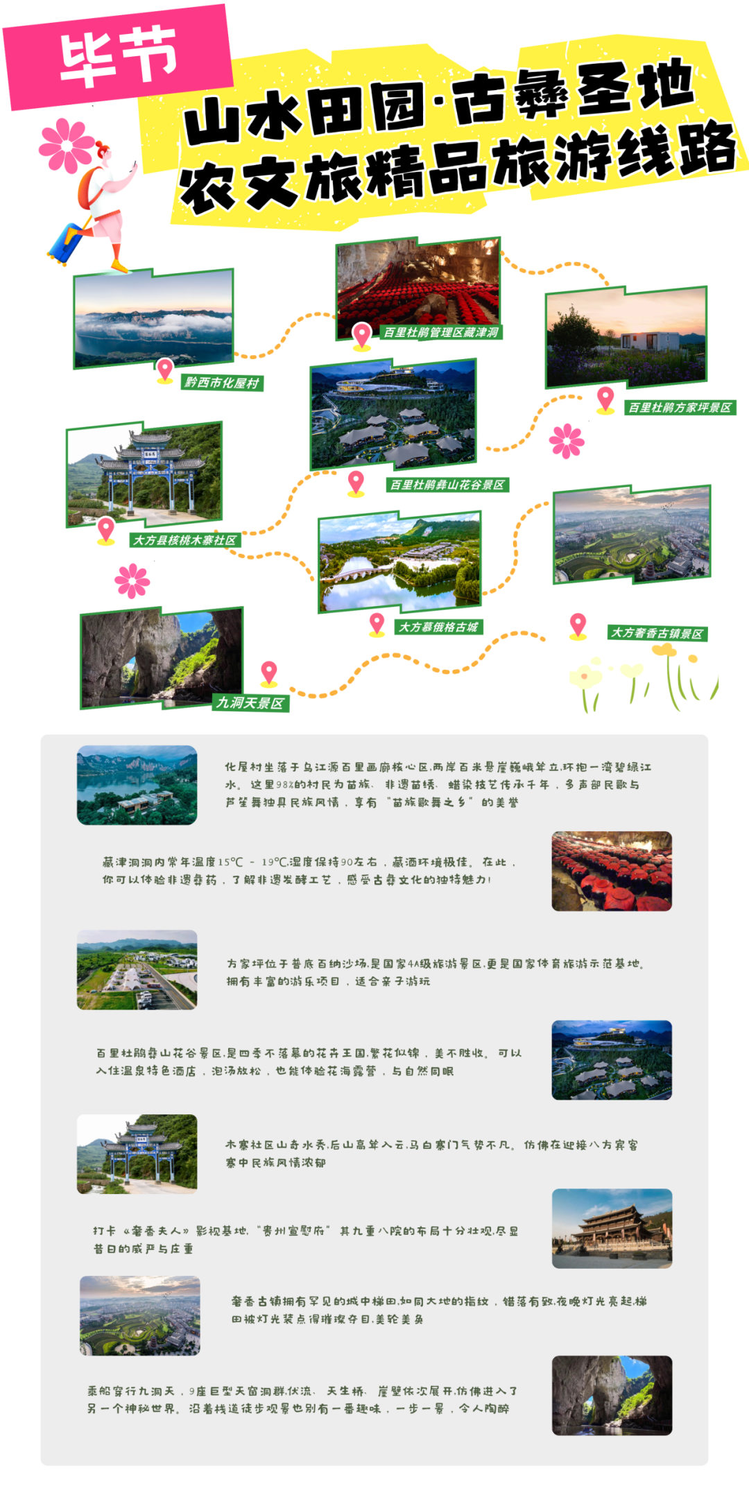 该线路由黔西市化屋村→百里杜鹃管理区百花村藏津洞→百里杜鹃方家坪景区→百里杜鹃彝山花谷景区→大方县核桃木寨社区→大方慕俄格古城文化旅游景区→大方奢香古镇景区→九洞天景区。这条线路如一串珠链,将毕节的农文旅之美精巧串联,韵味悠长。