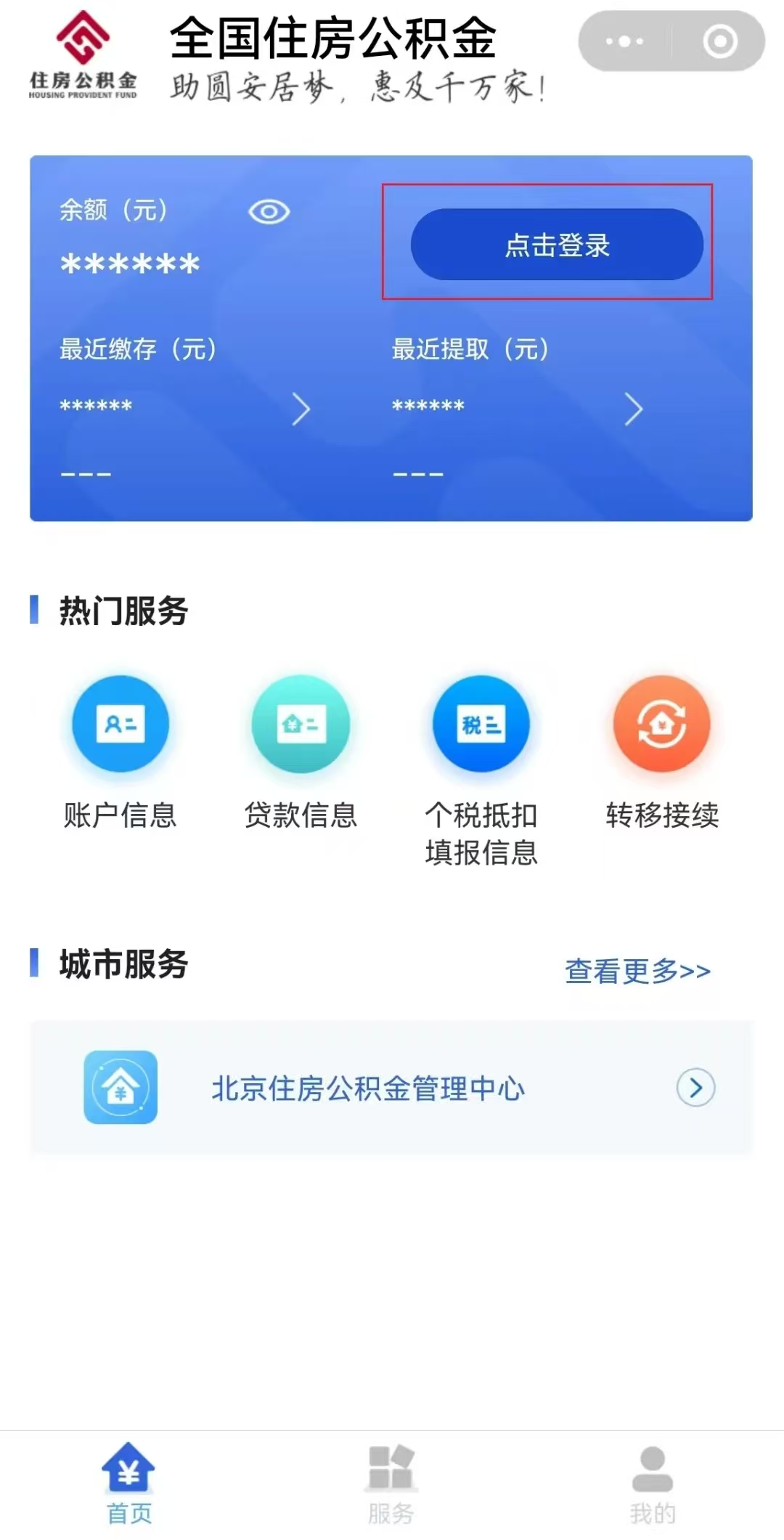 (一)在微信或支付宝等平台搜索“全国住房公积金公共服务”小程序或扫小程序码进入主页并点击登录。