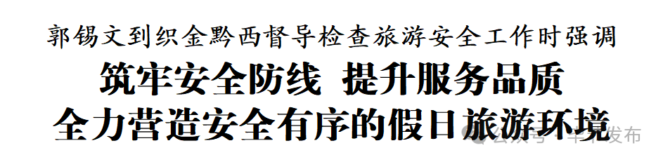 10月2日至3日,省委常委、市委书记郭锡文到织金县和黔西市督导检查旅游安全工作,看望慰问假期坚守岗位的干部职工,强调要深入学习贯彻习近平总书记关于安全生产的重要论述和在贵州考察时的重要讲话精神,切实筑牢安全防线,持续提升服务品质,全力营造安全有序的假日旅游环境。