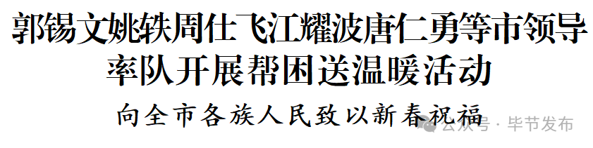 在农历马年春节即将来临之际,近日,省委常委、市委书记郭锡文,市委副书记、市长姚轶,市人大常委会主任周仕飞,市政协主席、市委常委、市委统战部部长江耀波,市委副书记、市委政法委书记唐仁勇等市领导,分别率队到各县(市、区)开展帮困送温暖活动,向全市各族人民致以新春祝福。