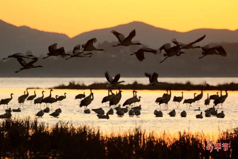 在威宁自治县贵州草海国家级自然保护区王家院子夜栖地内,黑颈鹤、灰鹤、斑头雁等鸟类成群起飞、觅食(沈光勇 摄)