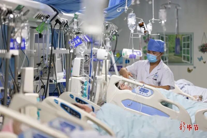 浙江省人民医院毕节医院重症医学科护士对患者进行护理(陈曦 摄)