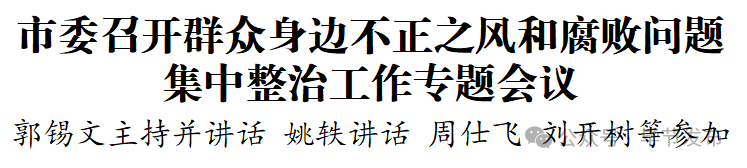 9月21日,市委召开专题会议,深入学习贯彻习近平总书记关于加强党的作风建设的重要论述,落实省委、省政府部署要求,坚持问题导向,全力纵深攻坚推进群众身边不正之风和腐败问题集中整治工作,让群众更加可感可及。省委常委、市委书记郭锡文主持会议并讲话。市委副书记、市长姚轶讲话,市人大常委会主任周仕飞、市政协主席刘开树等参加。